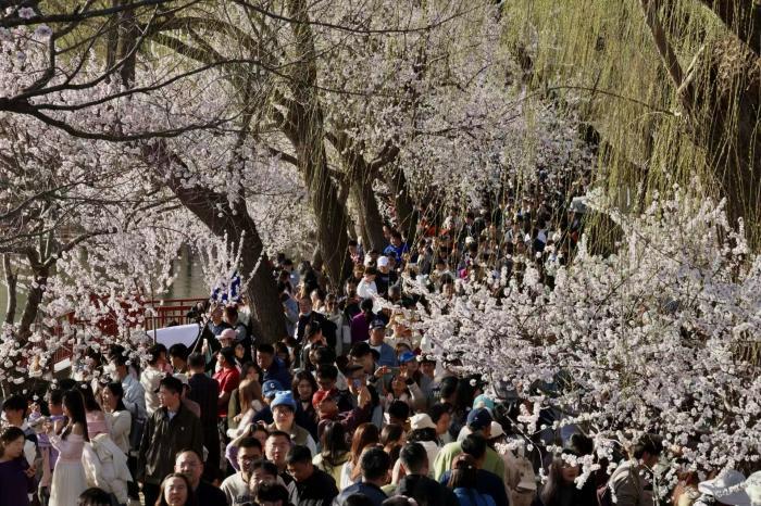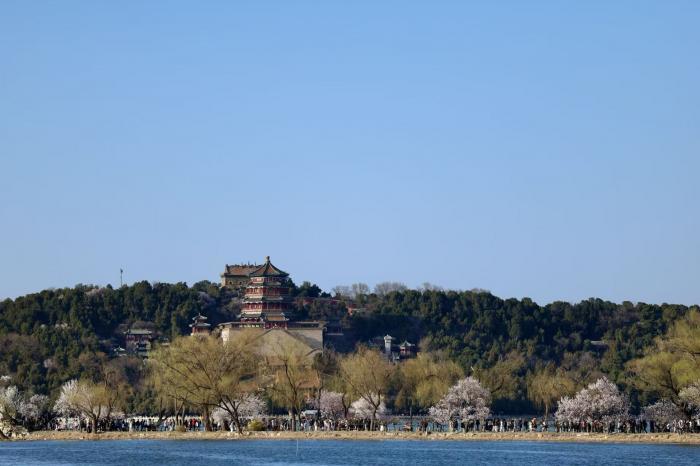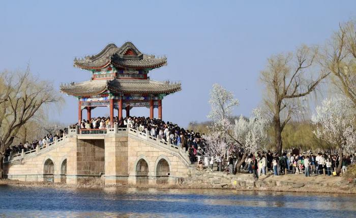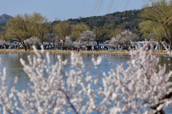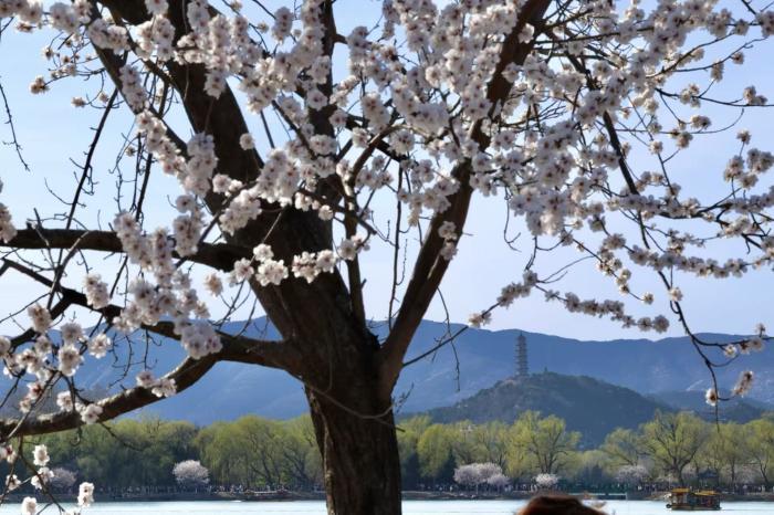 三月京城春意渐浓,颐和园西堤山桃迎来盛花期,粉白花枝与昆明湖碧水、古建红墙交相辉映,吸引大批市民游客前来踏青赏花。截至记者发稿时,颐和园当日累计接待游客已达13万人次,春日游园热度持续走高。