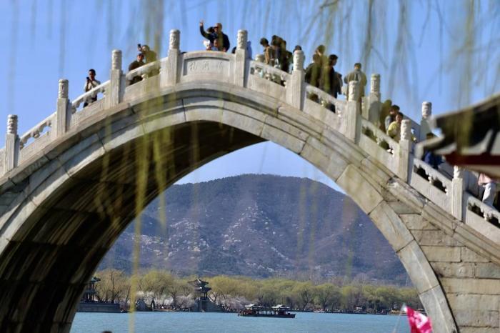 游客或驻足留影,或沿堤漫步,沉浸式感受皇家园林的春日意境。
