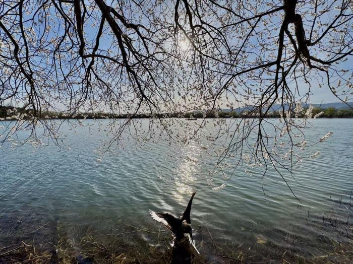 步入园区,西堤沿线近2000株山桃竞相绽放,粉白花瓣缀满枝头,与嫩绿新柳勾勒出“桃红柳绿”的春日盛景。