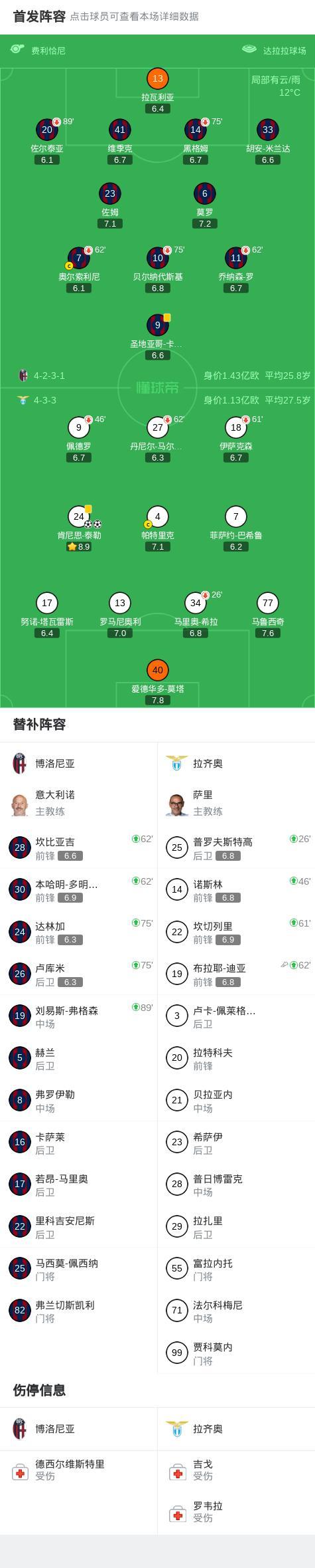 北京时间3月22日意大利足球顶级联赛第30轮,博洛尼亚主场对阵拉齐奥。上半场奥尔索利尼罚失点球,下半场肯尼思-泰勒首开记录,随后肯尼思-泰勒破门扩大比分。最终比分博洛尼亚0-2拉齐奥。