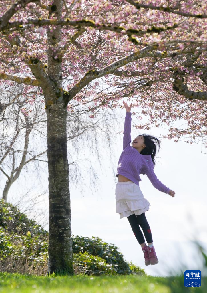 3月20日,在加拿大温哥华,一名女孩试图跳起触碰盛开的樱花。