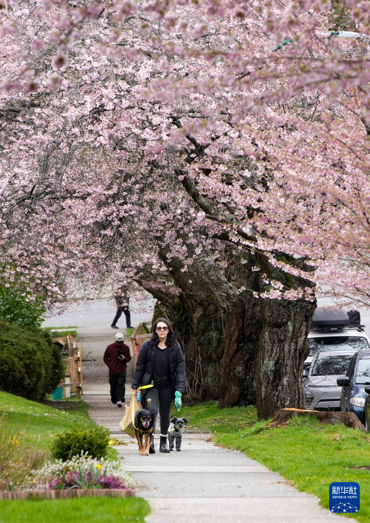 3月20日,在加拿大温哥华,一名女子在樱花盛开的街道上遛狗。