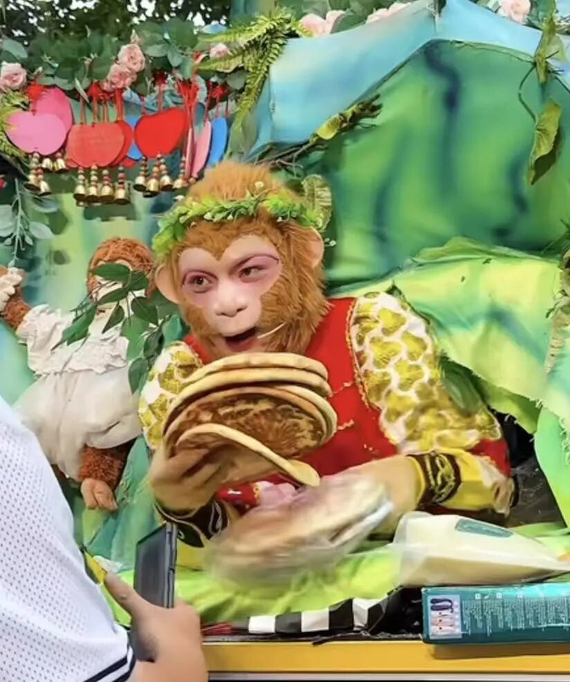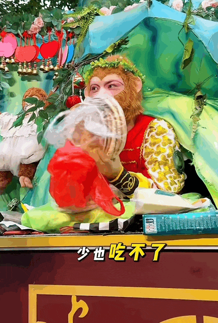 为了帮妈妈多卖点烤肠,猴哥直接化身师傅“唐僧”。