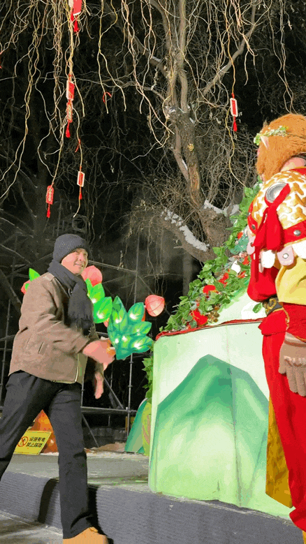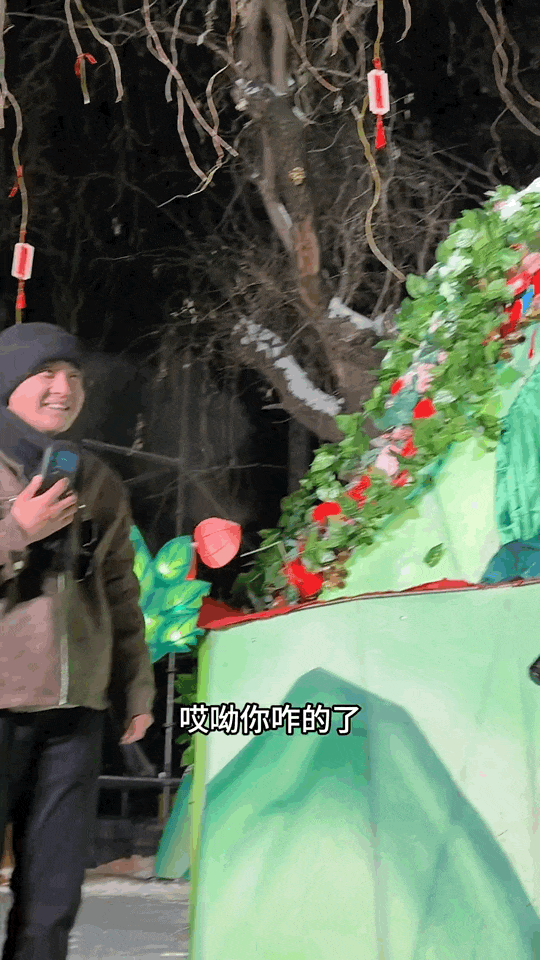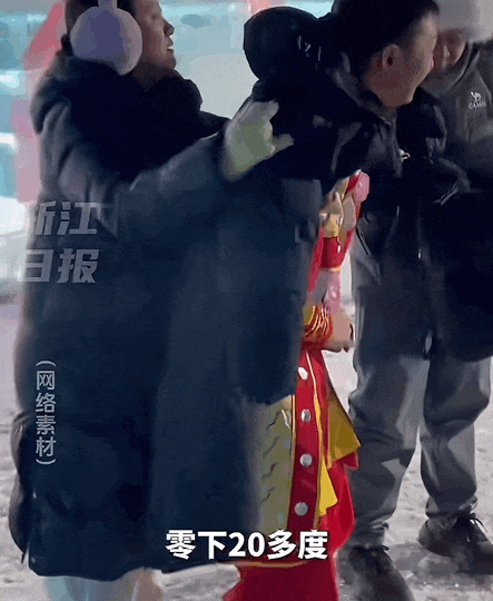 室外飘着雪,也能看到铁柱穿着单薄的演出服,在卖力演二人转。