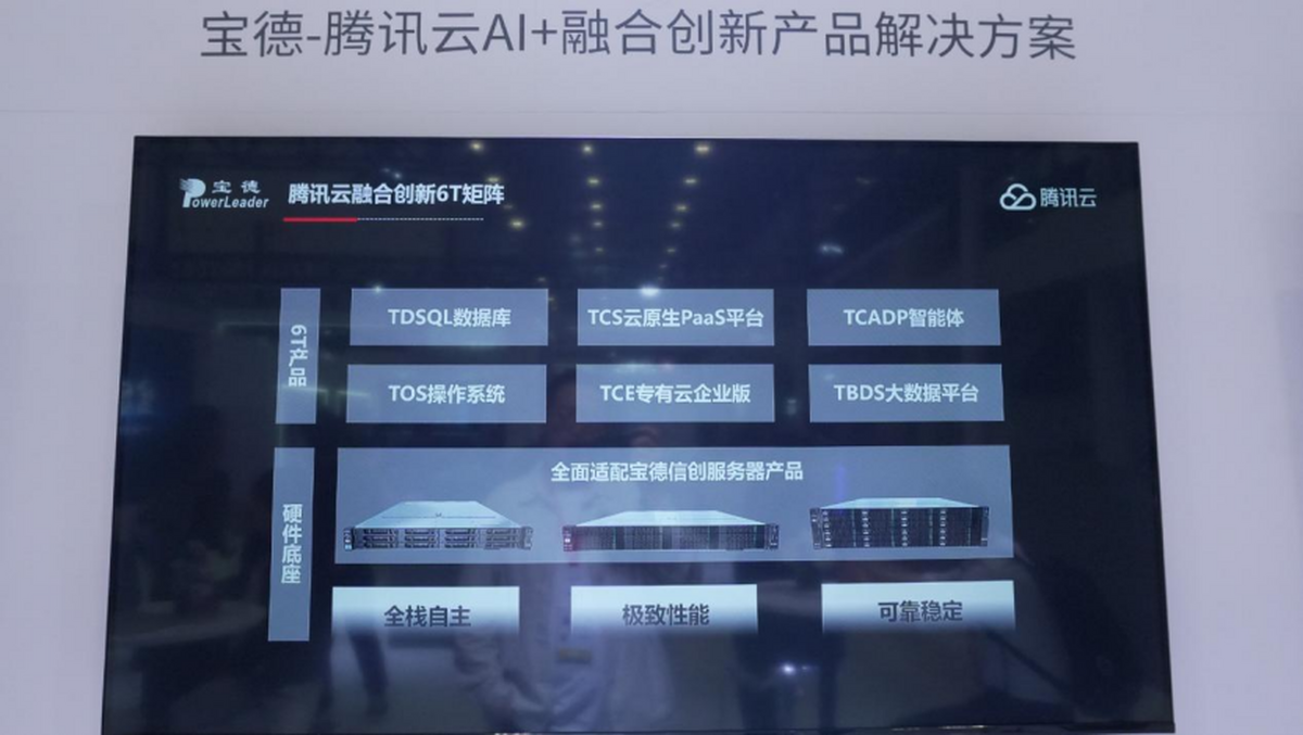 走进宝德的展区,引人注目的不仅有服务器设备,还与ISV伙伴联合打造了一系列的行业解决方案。腾讯云与宝德联合推出AI+融合创新产品解决方案,依托腾讯云“6T”产品矩阵,即TDSQL数据库、TOS操作系统\TCE专有云、TCS云原生 PaaS平台、TCADP智能体及TBDS大数据平台,已全面适配宝德信创服务器产品。政企客户由此可实现硬件至底层基础软件的全栈自主可控,为转型升级筑牢稳定可靠的底座支撑。