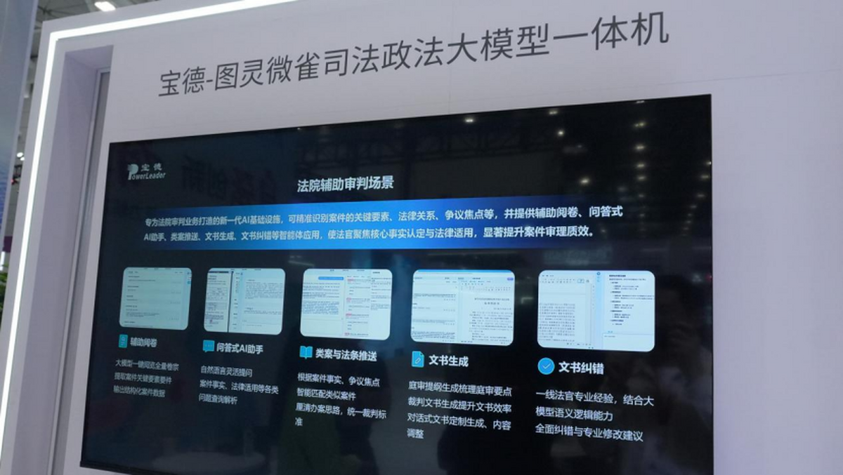 宝德与图灵微雀联合打造的“图灵昇腾司法AI一体机”,面向法院、检察院、司法局等场景,提供辅助阅卷、文书生成、类案推送、量刑建议等智能体应用。现场演示数据显示,法官平均阅卷时间由4小时缩短至1小时,文书制作时间由2小时压缩至30分钟。