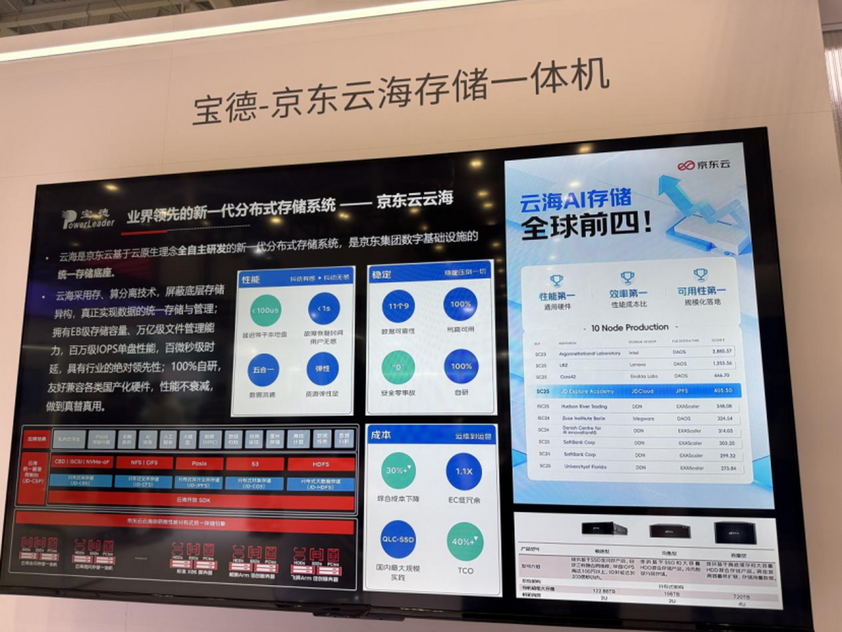宝德与京东云联合推出“云海存储一体机”,采用存算分离架构,实现EB级容量与百万级IOPS,100%自研并适配国产化硬件,已在建设银行、荔枝FM、永辉超市等客户实现规模化应用。