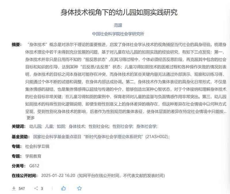 受到争议的论文《身体技术视角下的幼儿园如厕实践研究》。图源:知网截图