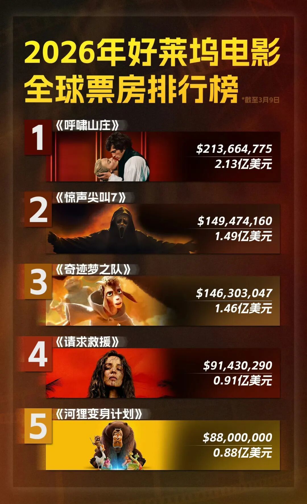 从票房表现来看,《暗黑新娘!》全球首周末票房仅1360万美元,远低于预期,而其制作成本高达9000万美元,堪称血本无归。《至尊马蒂》和《呼啸山庄》成绩尚可,前者约2亿美元,刷新了A24的票房纪录;《呼啸山庄》票房目前已突破2亿美元,暂列2026年好莱坞电影全球票房冠军。但值得注意的是,《至尊马蒂》与《呼啸山庄》的制作、宣发成本都不算低,收支是否平衡仍未知。