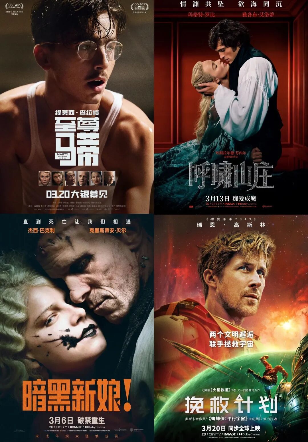 的确,本月上映的引进片中,不乏明星云集、班底雄厚的热门选手,例如提莫西·查拉梅主演的《至尊马蒂》、克里斯蒂安·贝尔与杰西·巴克利合作的《暗黑新娘!》、玛格特·罗比和雅各布·艾洛蒂演绎的《呼啸山庄》,以及瑞恩·高斯林领衔的《挽救计划》。这些影片在上映前都被寄予厚望,是引进片中的热门选手。