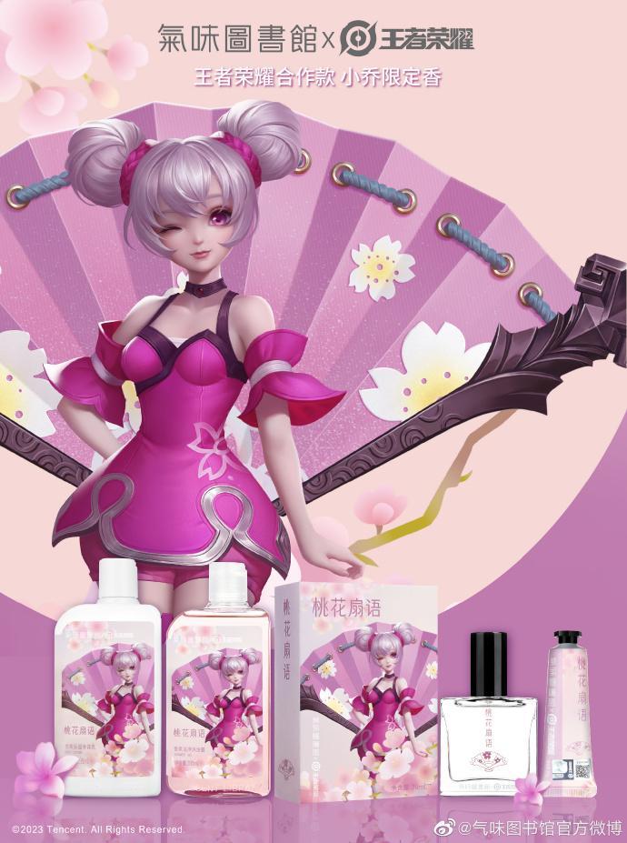 目前,国内香水香氛品牌为联名开发新产品的例子还比较少。王者荣耀和气味图书馆的联名算一例:2022年,双方的首次合作是限量发售的520礼盒,两只15ml香水售价290元。次年,气味图书馆又官宣了小乔限定香型“桃花扇语”,并推出了包含香水、洗护和护手霜的系列产品,30ml香水定价225元。不过,如果仔细观察这款合作限定香“桃花扇语”的香调描述,会发现和气味图书馆的旧款香水“桃花运”几乎完全重合。