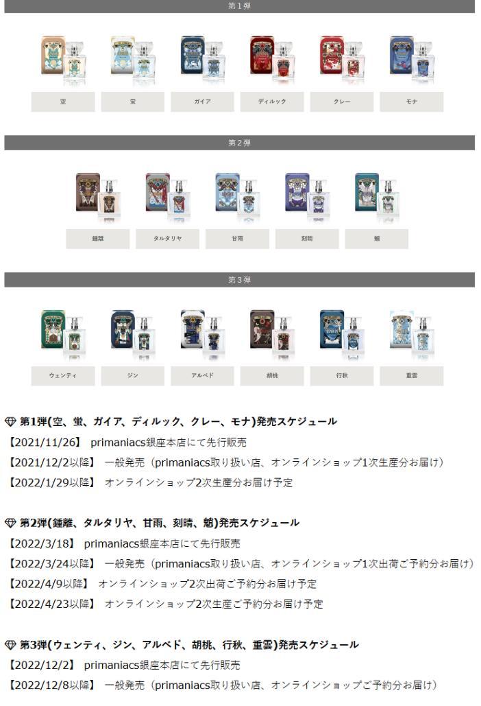 其中,较活跃的是专营二次元周边香水的品牌Primaniacs。它以每月3-4个IP的速度稳定上新联名产品,均为根据角色重新设计的香型。