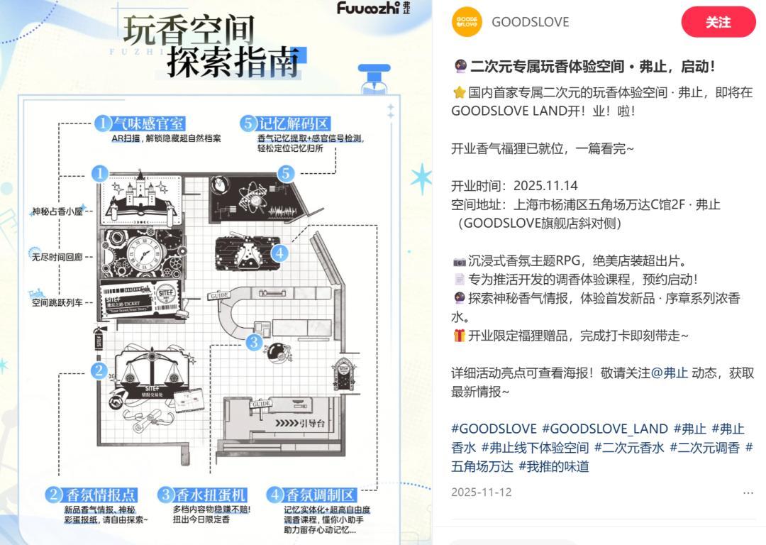 在国内,已经有人开始尝试这种“职业选手”的打法了。去年年底,国内头部连锁谷店GOODSLOVE在其旗舰店旁,悄悄布下了一家名为“弗止”的香氛空间。弗止在全国多个GOODSLOVE门店投放了试香活动,自称为“专注ACGN领域的香气生活方式品牌”。其主营业务除了香氛周边,还包括角色印象香的调制体验:店内提供角色印象香气的推荐配方,玩家可以在此基础上自由发挥。在一定程度上,“体验感”让香水本身的溢价性质变得容易让人接受了一些,“自行调配”也能回避一些粉丝“接受不了官香味道”的尴尬。