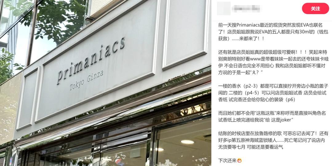 Primaniacs官方账号的介绍是“一家能让你邂逅屏幕另一端那个人的角色香氛专门店”。不少人分享过在线下门店试香的经历:店员态度温柔,熟悉联名过的作品,在近似同好聚会的氛围下很容易冲动消费。