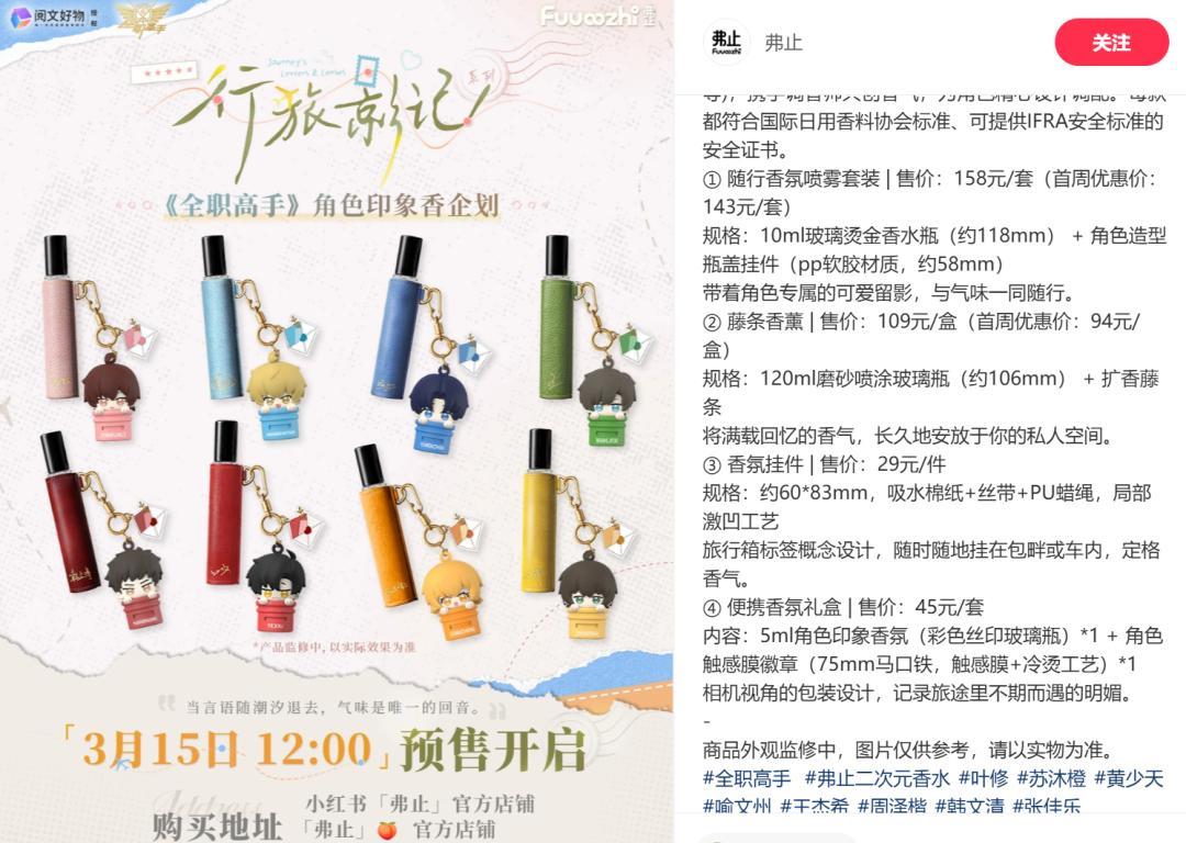 就在几天前,《全职高手》的角色印象香企划在预售开始前十分钟突然宣布了延期。该企划由IP方阅文好物授权,出品方是与谷子零售巨头GOODSLOVE关系紧密的“二次元香水品牌”弗止:使它出师不利的反对声浪,同样集中在“太贵”、“不值”和“割韭菜”。