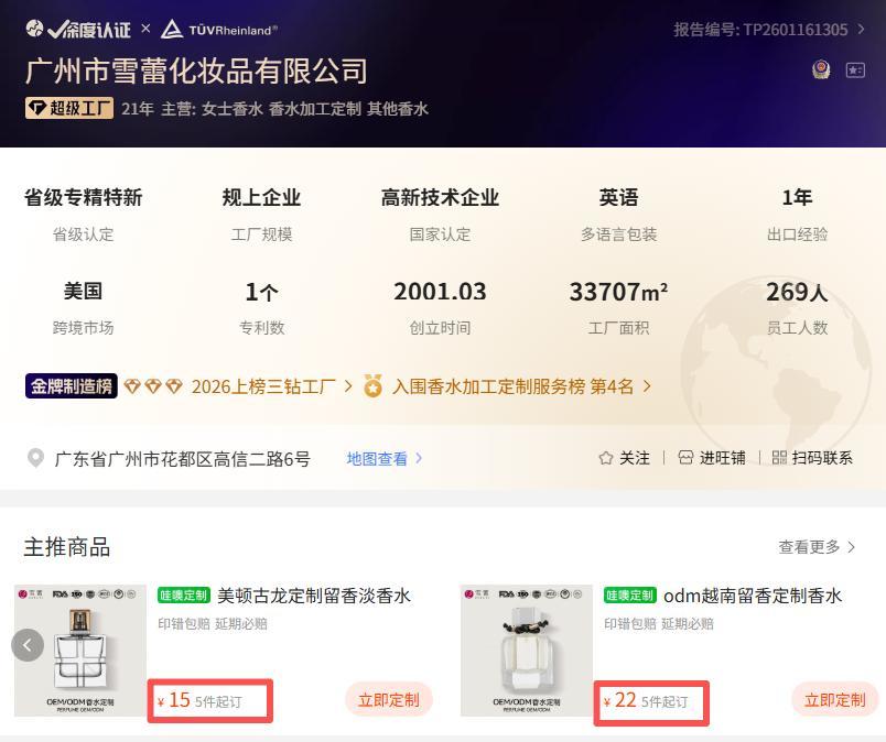 一面是泼天的富贵,一面却是连绵不绝的讨伐声。叠纸公开的信息显示,香水的代工厂为广州市雪蕾化妆品有限公司。该工厂曾为名创优品等品牌的平价香水香氛提供代工服务,如9.9元的檀木香身体喷雾和15元的荒岛孤玫香水。网友们顺着这条线索摸到1688,发现雪蕾的自有品牌美顿香水和定制香水的批发报价在20元左右——和430元有着数十倍的价格差距。