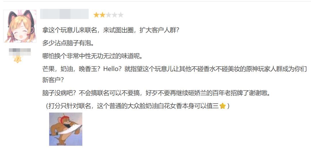 营销方面,娇兰和米哈游也可谓两败俱伤。游戏玩家对联动并不买账,女性玩家不满角色高开衩的暴露裙装,男性玩家则“米哈游和以女性消费者为主的品牌合作”感到不满,甚至传出该角色是内部女性画师的“皮套”,“把玩家的钱送给自己看中的品牌”的流言。而对娇兰来说更致命的是,香水是一件极其私密、情绪化的产品,气味不符合垂类IP受众对角色的设想或在其次,如果落得一句“不好闻”,它连最基本的使用价值都会瞬间清零,也会伤害到“香水大牌”的声誉。