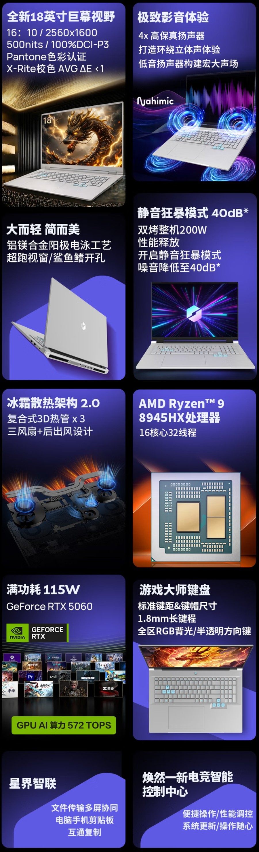配置方面,机械革命苍龙 18 Pro提供了双旗舰处理器选项,用户可选择AMD锐龙9 8945HX 或锐龙9 9955HX 处理器,其中锐龙9 8945HX 采用 16 核 32 线程规格,具备强悍的多任务处理与游戏算力表现。显卡方面,新品搭载满功耗 115W 的 GeForce RTX 5060 显卡,GPU AI 算力可达 572 TOPS,同时也提供 RTX 5070 显卡版本可选,整机双烤性能释放最高可达 200W,能够轻松驾驭各类 3A 游戏大作与重度视频剪辑、3D 建模等创作任务。散热与性能释放方面,该机搭载冰霜散热架构 2.0,采用 3 根复合式 3D 热管,搭配三风扇+后出风的散热设计。同时新品还支持静音狂暴模式,开启后可实现性能全释放,同时将运行噪音降低至 40dB。