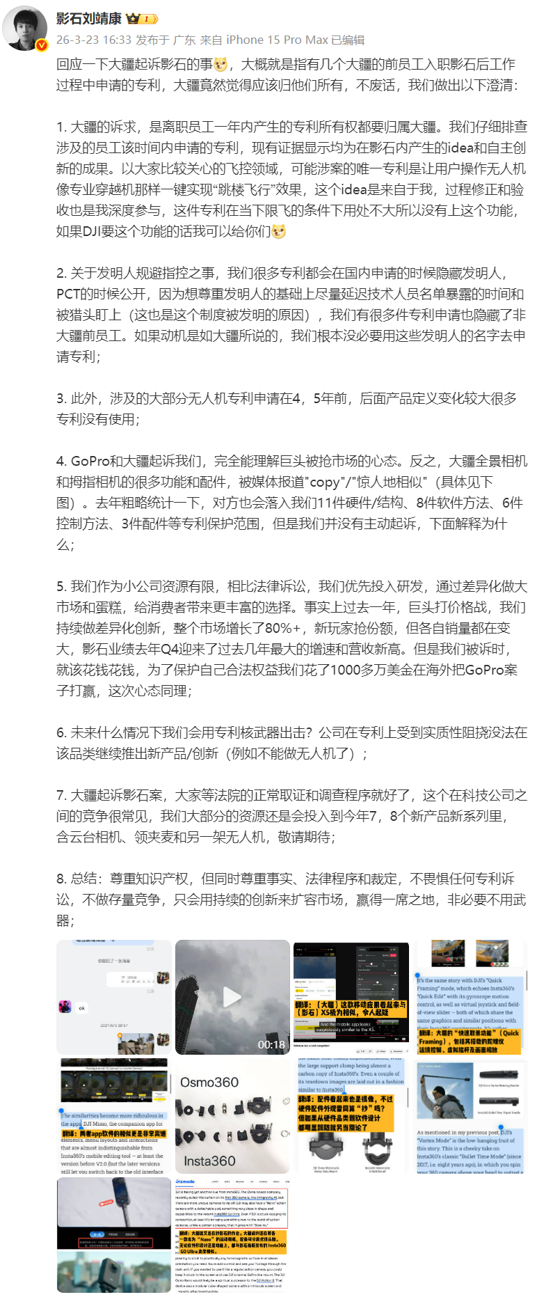 据远近新闻,3月23日,影石创始人刘靖康发文回应被大疆起诉。