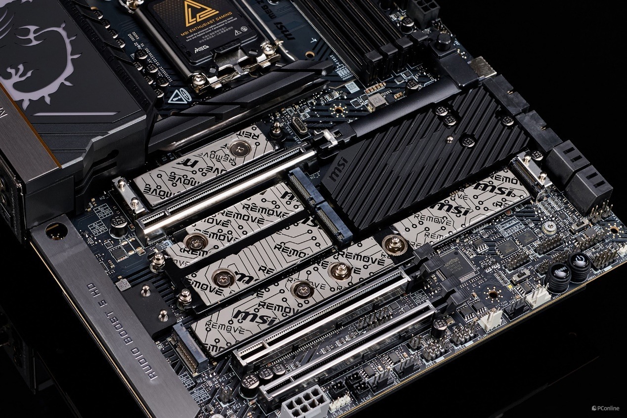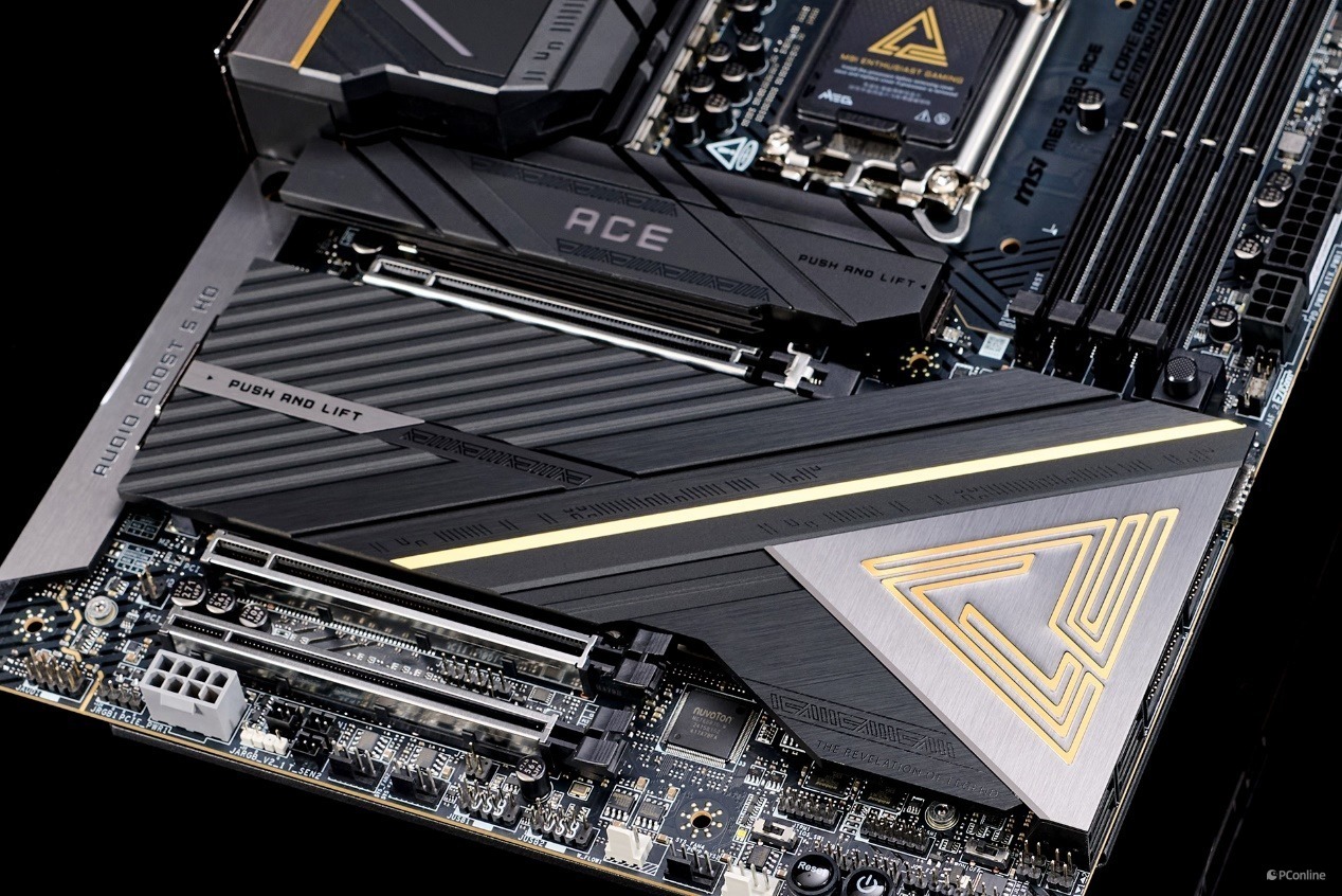 另外,微星MPG Z890 ACE主板还提供了三条全长的PCIe x16插槽,并都做了金属装甲加固,第一条和第二条均为CPU直连的PCIe 5.0 x16插槽,第三条来自芯片组,支持PCIe 4.0 x4运行规格。