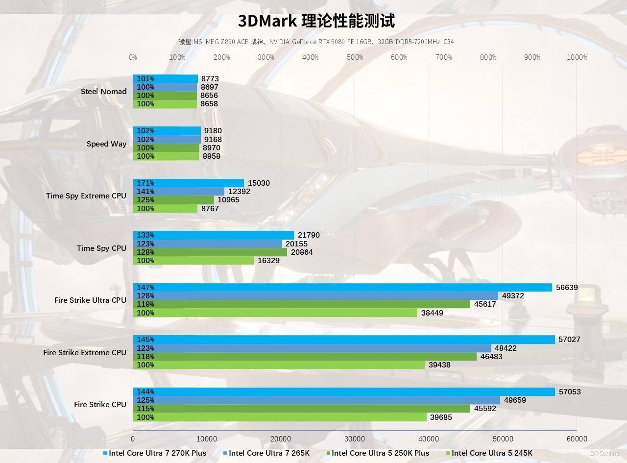 游戏测试前,先用3DMark看看CPU的性能表现,3DMark 是全球通用的游戏性能基准测试工具,覆盖 DX12、DX11 等主流图形 API,适配从入门级到旗舰级的全平台游戏负载。实测酷睿 Ultra 5 250K Plus 在 DX12 Time Spy CPU 测试中得分 20864,相比245K提升 28%,DX11 Fire Strike CPU 测试得分 45592,提升约15%。至于酷睿 Ultra 7 270K Plus 性能跃升更为显著,Time Spy CPU 得分 21790,相较265K提升 10%,Time Spy Extreme CPU 得分 15030,提升 30%,Fire Strike Ultra CPU 得分 56639,同样也有接近20%的提升,即便是最新的 Speed Way、Steel Nomad 测试项目,也实现了 1%-2% 的领先。