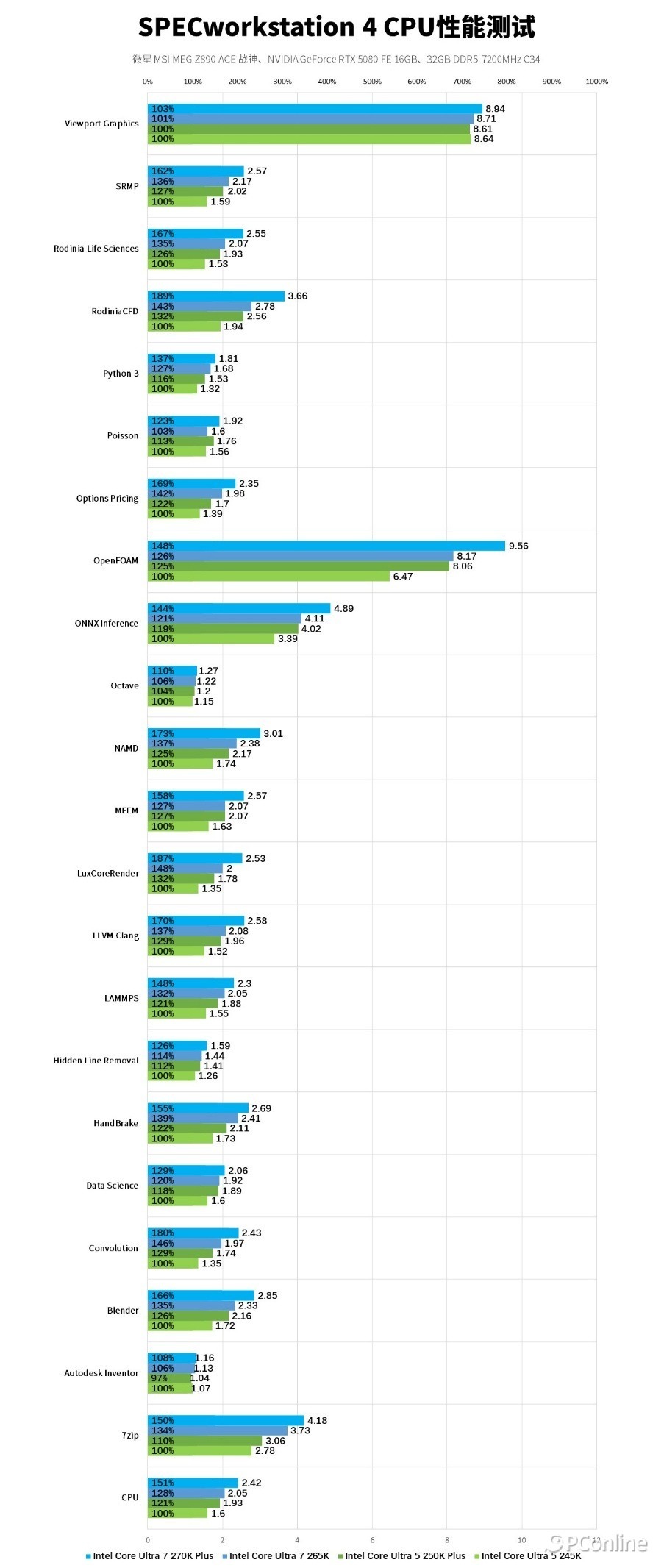 最后再上点强度,来点工业级的测试,SPECworkstation 4 是面向专业工作站级别的权威性能测试工具,覆盖科学计算、工程仿真、流体力学、3D 渲染、数据科学等专业领域,能全面衡量处理器在工业级、科研级重度负载下的综合性能。实测数据显示,酷睿 Ultra 7 270K Plus 在全场景测试中实现全面领先,其中流体力学 RodiniaCFD 场景相较前代提升 46%,3D 渲染 LuxCoreRender 场景则提升 39%,数值计算 Convolution 场景也有34%的增幅;酷睿 Ultra 5 250K Plus 在各专业场景中也均实现 10% 以上的稳定提升,部分项目甚至提升幅度有20%以上,为工业设计、科研计算等专业场景提供了充足的算力支撑。