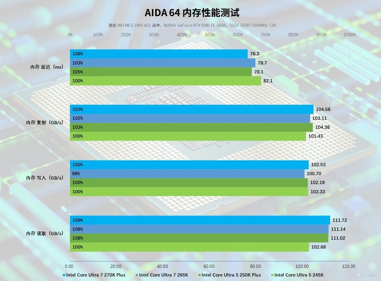 从实测数据来看,两款新品不仅完美适配高频内存,更在带宽与延迟两大核心指标上实现了全面优化:旗舰款酷睿 Ultra 7 270K Plus 内存读取带宽达到 111.72GB/s,内存复制、写入带宽分别达到 104.58GB/s、102.53GB/s,同时将内存延迟压低至 76.3ms,酷睿 Ultra 5 250K Plus 同样表现不俗,内存读取带宽达到 111.02GB/s,内存延迟优化至 78.1ms,带宽与延迟表现全面超越前代产品,而且这款处理器也是提升最大的,对比前代足足强了8%。