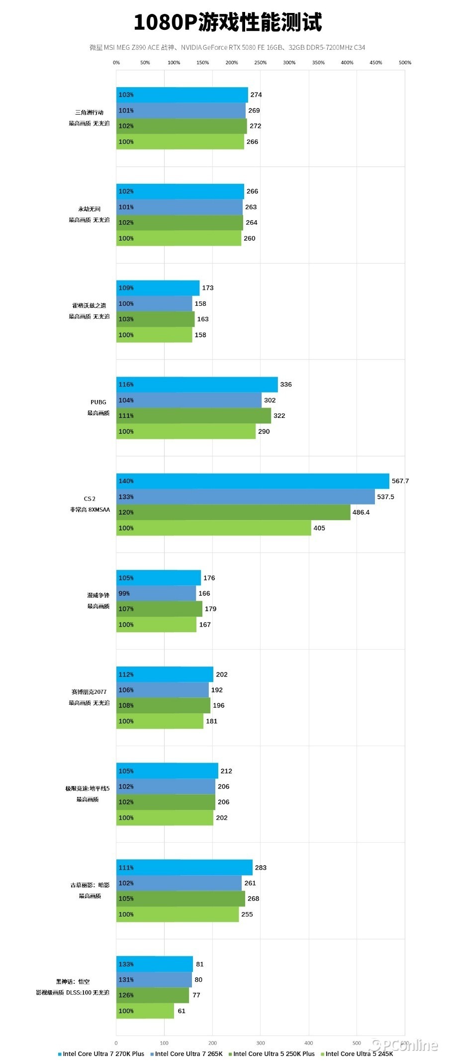 酷睿 Ultra 7 270K Plus 则比前代强了5-6%,同样实现全场景领跑,电竞网游中性能优势拉满,《CS2》平均帧率达到 567.7FPS,对比酷睿 Ultra 7 265K 有7%的领先;《PUBG》平均帧率 336FPS,提升12%。3A 大作中同样表现稳定,《黑神话:悟空》平均帧率 81FPS,《赛博朋克 2077》平均帧率 202FPS,即便是 CPU 负载较高的开放世界场景,也能保持稳定的高帧率输出,为玩家带来丝滑的游戏体验。