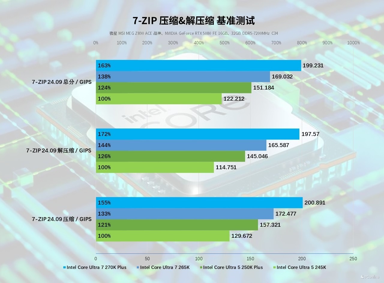 以酷睿 Ultra 5 245K 为性能基准,酷睿 Ultra 5 250K Plus 综合总分达到 151.184 GIPS,相较245K提升24%;旗舰款酷睿 Ultra 7 270K Plus 综合总分逼近 200 GIPS 大关,达到 199.231 GIPS,相较前代也实现 25% 的大幅跃升。细分项目中,两款新品的压缩与解压缩性能也同步拉满,其中酷睿 Ultra 7 270K Plus 解压缩性能提升幅度高达 30%左右,增加的能效核心大幅缩短了大文件、工程素材包的处理耗时,给办公与创作场景带来了肉眼可见的效率升级。