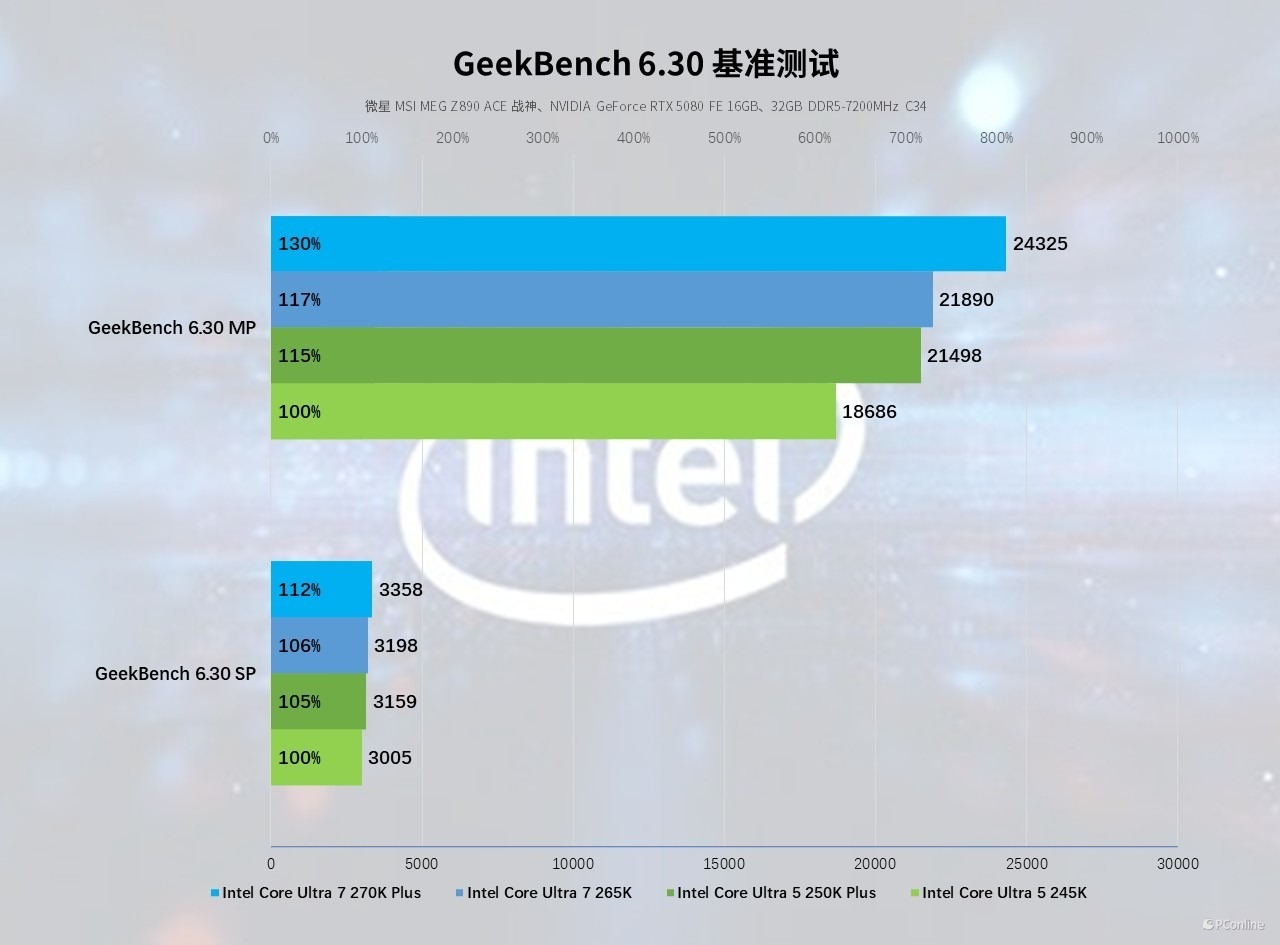 多核性能上,两款酷睿Ultra 200S Plus新品的核心扩容优势充分释放,酷睿 Ultra 5 250K Plus 得分 21498 分,相较基准款提升 15%;酷睿 Ultra 7 270K Plus 得分 24325 分,对比酷睿 Ultra 7 265K 也有 11% 的领先,在多任务并行、AI 计算、内容创作等场景下展现出更强的处理能力。