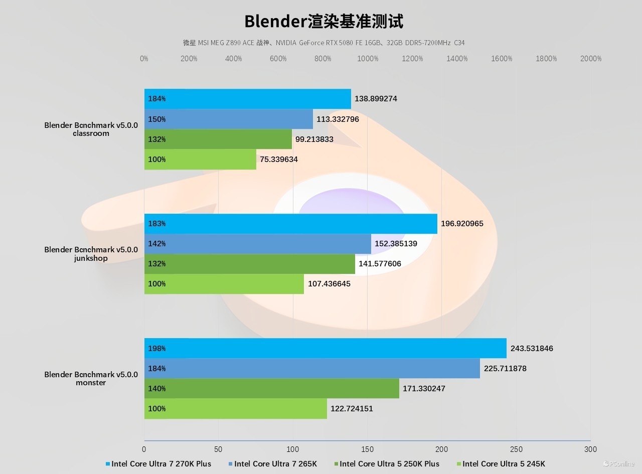 Blender 是当下主流的开源三维建模与渲染工具,广泛应用于动画制作、工业设计、视觉特效等领域,其官方基准测试能精准量化处理器的多线程渲染效率。本次测试覆盖 classroom、junkshop、monster 三大经典场景,以酷睿 Ultra 5 245K 为性能基准,酷睿 Ultra 5 250K Plus 在三大场景中均实现 32% 以上的性能提升;酷睿 Ultra 7 270K Plus 表现更为亮眼,对比酷睿 Ultra 7 265K 也有着 14-40% 的领先,大幅缩短了复杂三维场景的渲染耗时。