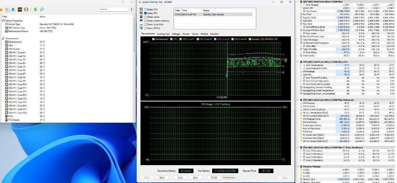 换作主流级别的英特尔酷睿Ultra 5 250K Plus,同样是解开限制的MSI Unlimited Settings模式,此时处理器功耗为200W,全核平均频率也能逼近4.8GHz,并且温度表现也非常亮眼,仅有76℃!所以选择酷睿Ultra 5的玩家大可不必担心,无论是何种设置,常规的风冷也能轻松压制。