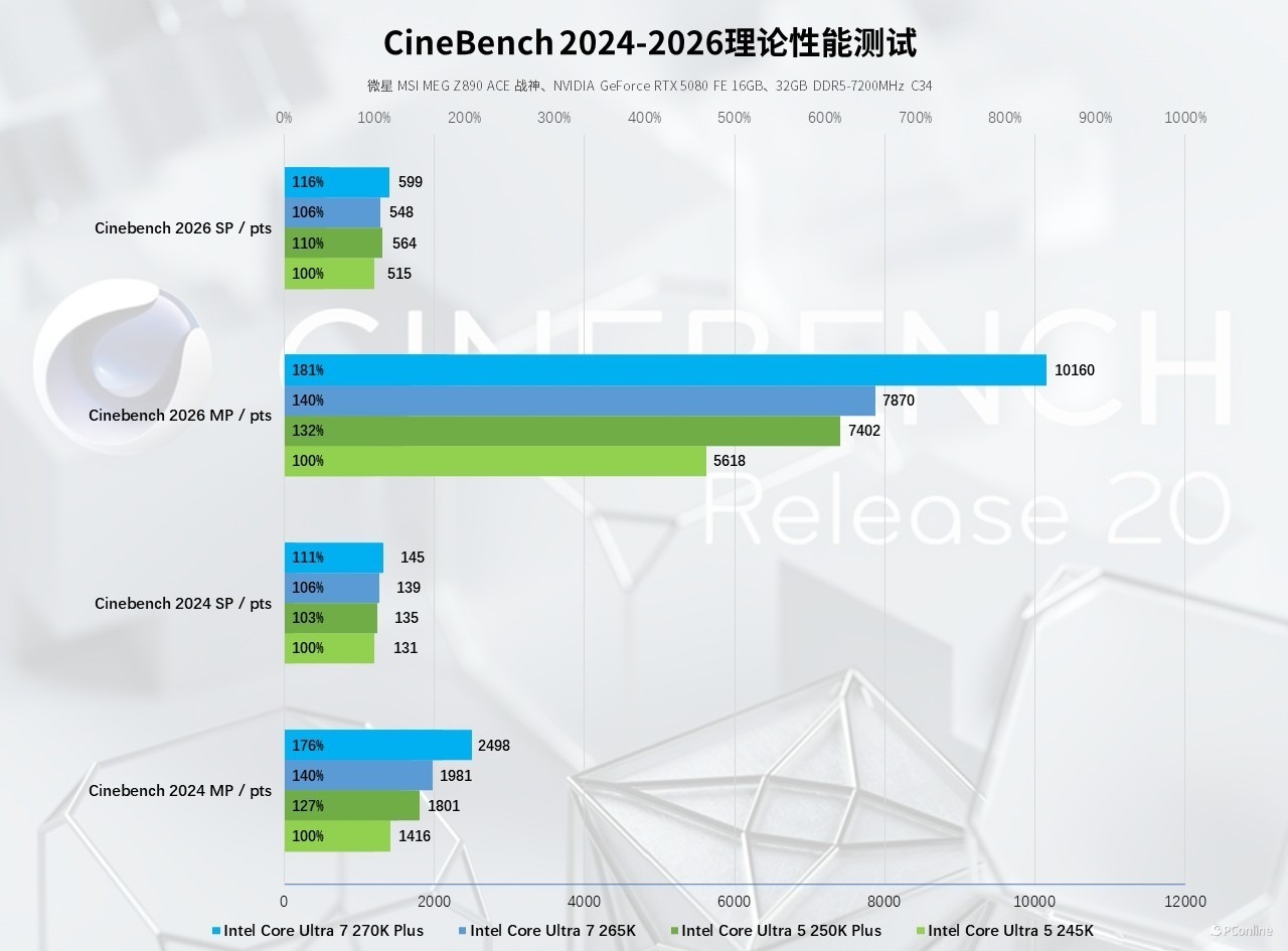 多核性能方面,两款新品的核心优势同样得到了充分释放,完全适配现代渲染引擎的多线程调度逻辑。酷睿 Ultra 7 270K Plus 在 CineBench 2026 多核测试中得分 10160pts,对比酷睿 Ultra 7 265K 领先幅度达到 29%;CineBench 2024 多核得分 2498pts,对比酷睿 Ultra 7 265K 也有 26% 的领先。酷睿 Ultra 5 250K Plus 同样表现不俗,CineBench 2026 多核得分 7402pts,相较前作提升 32%;CineBench 2024 多核得分 1801pts,也提升了 27%,无论是专业工作室的重度动画渲染任务,还是自媒体创作者的日常视频剪辑、特效制作,都能提供充足的性能支撑。
