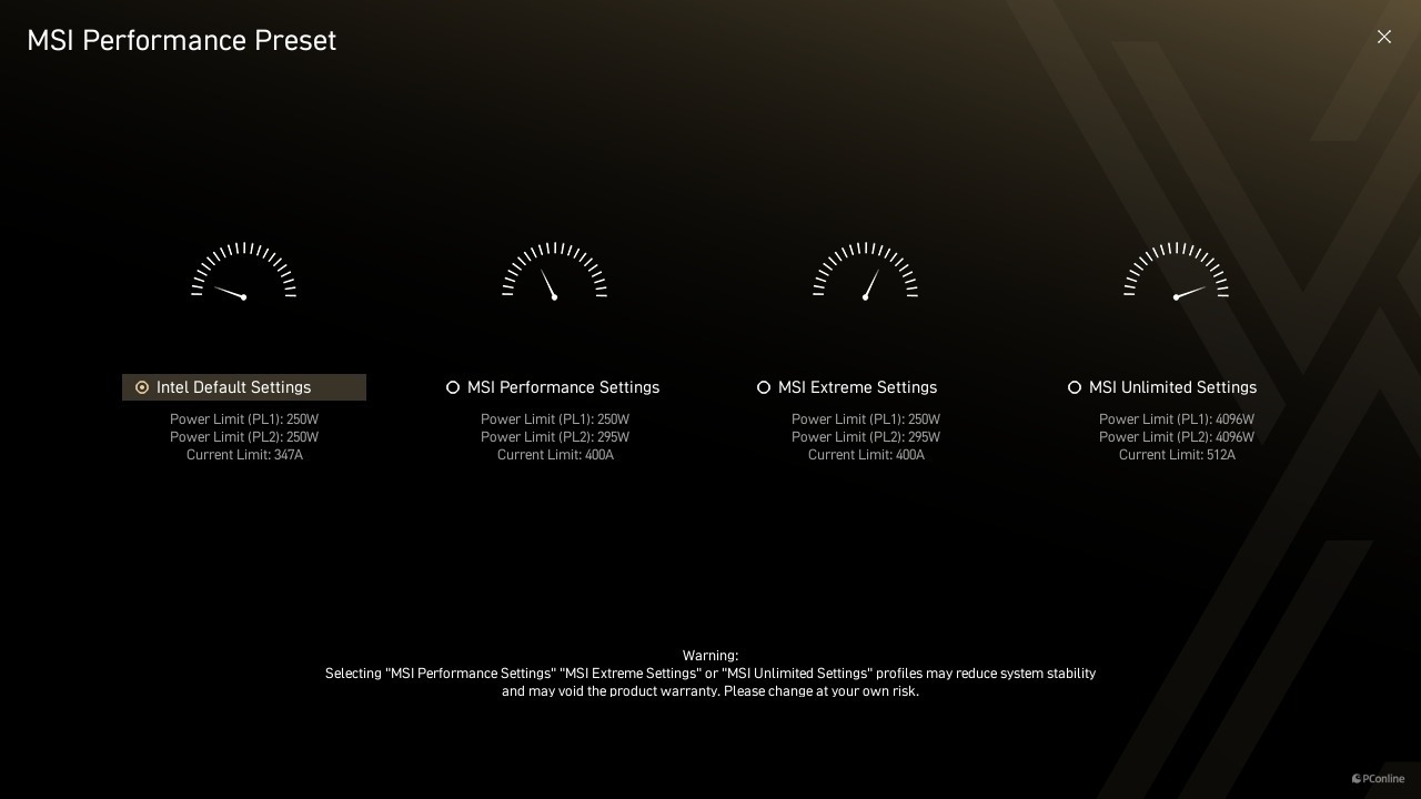 软件层面,微星MEG Z890 ACE战神为英特尔酷睿Ultra 200S Plus系列处理器提供了4种模式可选,即Intel Default Settings、MSI Performance Settings、MSI Extreme Settings以及性能释放最激进的MSI Unlimited Settings。