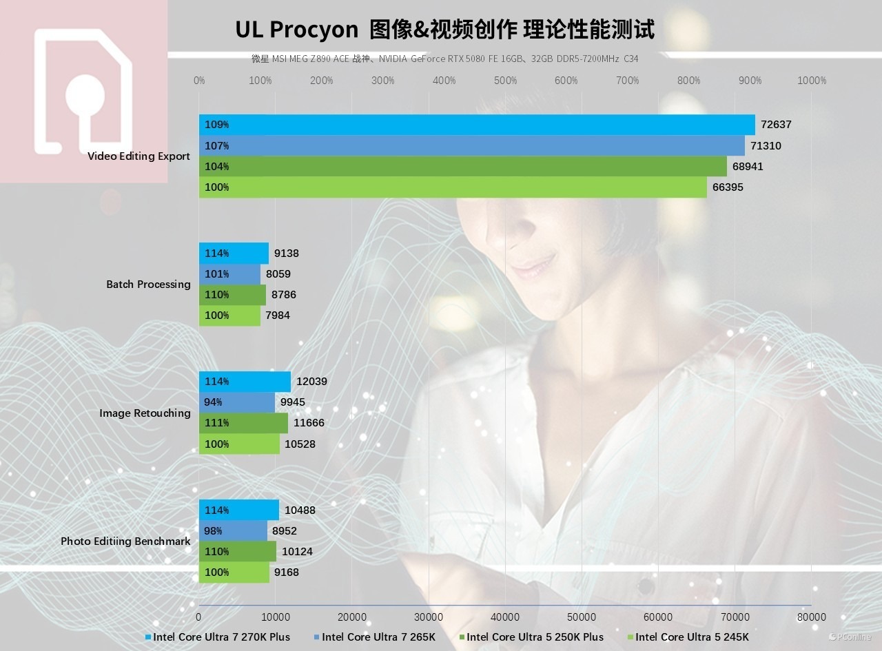 酷睿 Ultra 5 250K Plus 在各子项中均实现 4%以上 的稳定提升,其中图片精修、照片编辑子项提升幅度达 11%;酷睿 Ultra 7 270K Plus 全面领跑,视频编辑导出得分 72637,而批量处理、图片精修等子项更是实现 14% 的性能跃升,大幅提升了日常创作的工作效率。