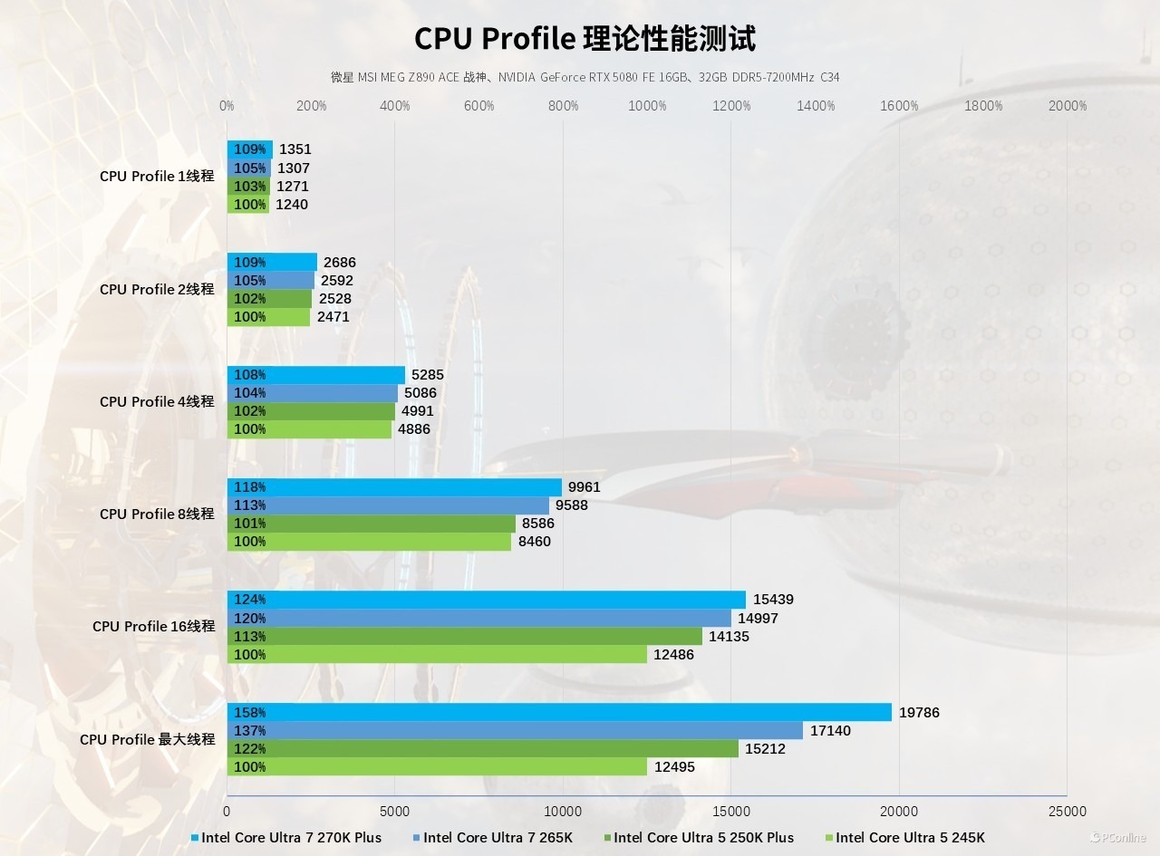 至于CPU Profile测试则与前面的理论性能测试类似,完美展现了酷睿Ultra 200S Plus在增加核心数上的优势。酷睿 Ultra 5 250K Plus 在 1-4 线程的游戏核心负载场景中,均实现 2% 以上的性能提升,16 线程与最大线程场景分别提升 13%、22%;酷睿 Ultra 7 270K Plus 则是全梯度领跑,1 线程得分 1351,相较前代提升 4%,完美适配竞技游戏的单核性能需求,最大线程得分 19786,提升约21%,可轻松应对游戏 + 直播 + 后台多开的复合重度游戏负载。