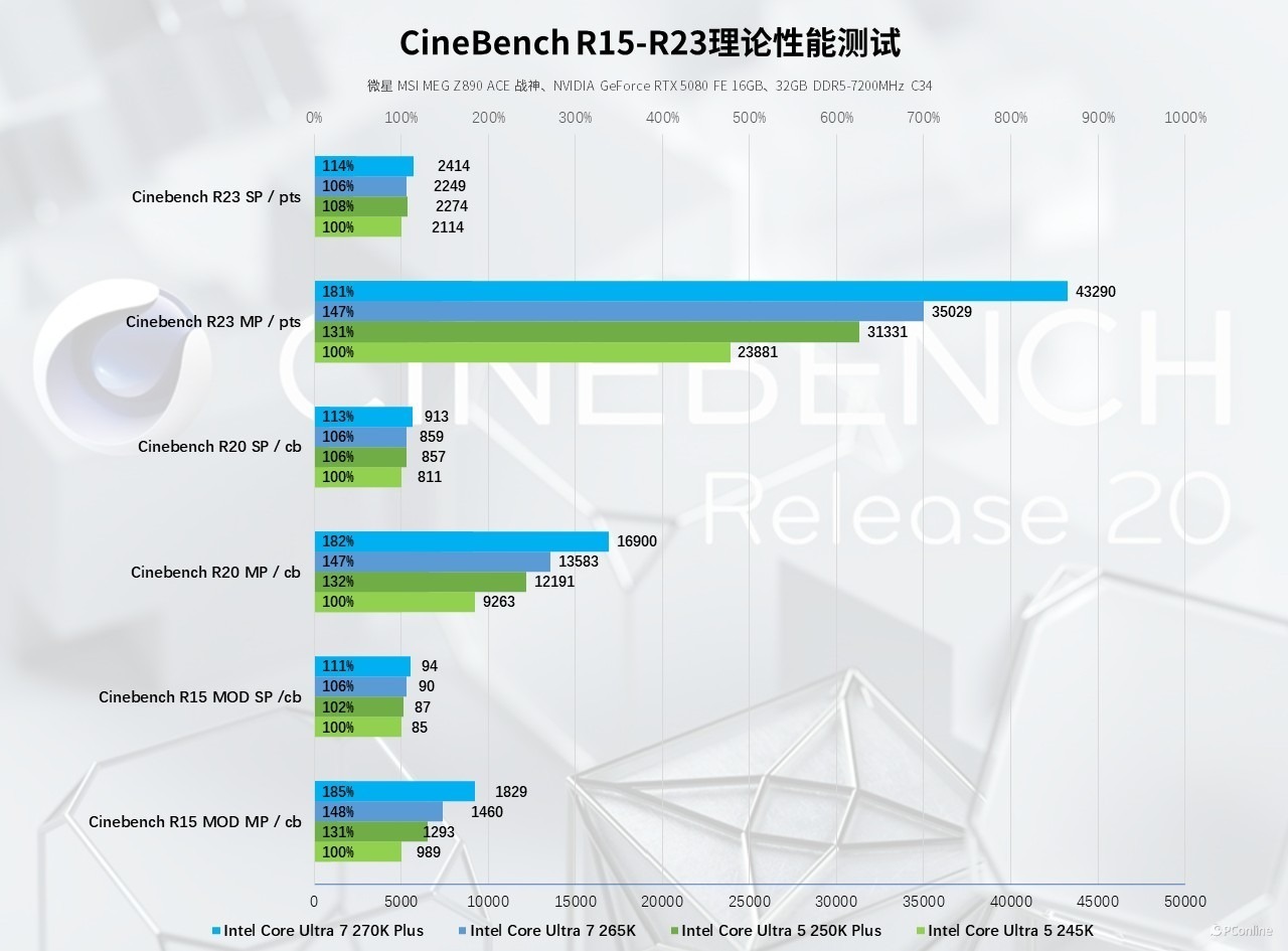 多核渲染性能是本次升级的核心亮点,核心规格的扩容带来了跨越式的性能跃升。酷睿 Ultra 7 270K Plus 在 CineBench R23 多核测试中得分 43290pts,对比酷睿Ultra 7 265K有23% 的显著领先;CineBench R20 多核得分 16900cb,提升35%;CineBench R15 多核得分 1829cb,提升幅度更是接近40%。酷睿 Ultra 5 250K Plus 的多核性能同样实现越级升级,整体提升 31%,大幅缩短了三维场景渲染、视频帧合成等工作的处理耗时。