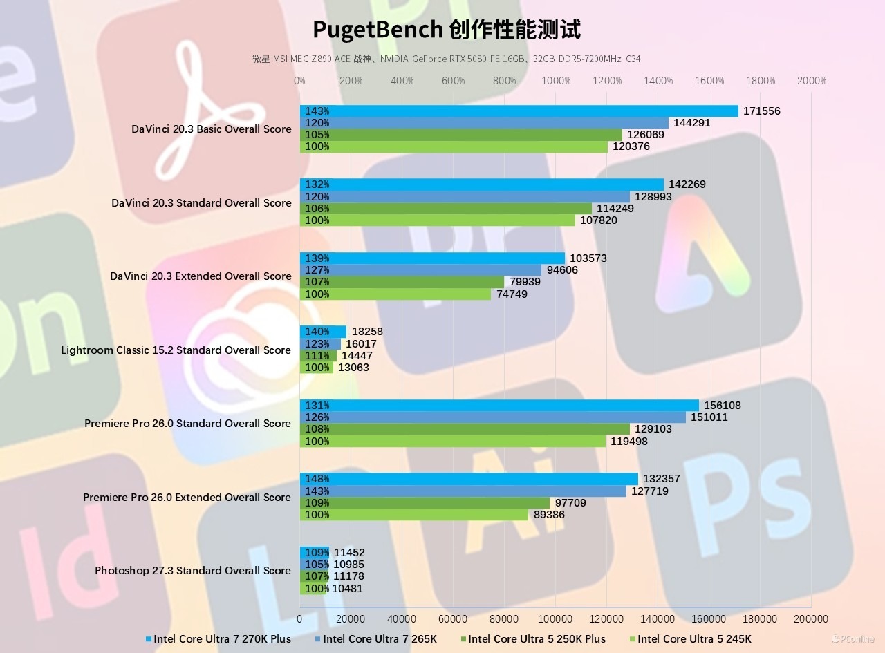 实测可以看到,酷睿 Ultra 5 250K Plus 在各软件测试中均实现 5% 以上的提升;酷睿 Ultra 7 270K Plus 表现更是全面越级,尤其是在视频领域,例如:其DaVinci Resolve 基础场景得分 171556,相较前代提升23%,Premiere Pro 扩展场景得分 132357,提升约5%,完全能满足专业工作室级别的重度创作需求。
