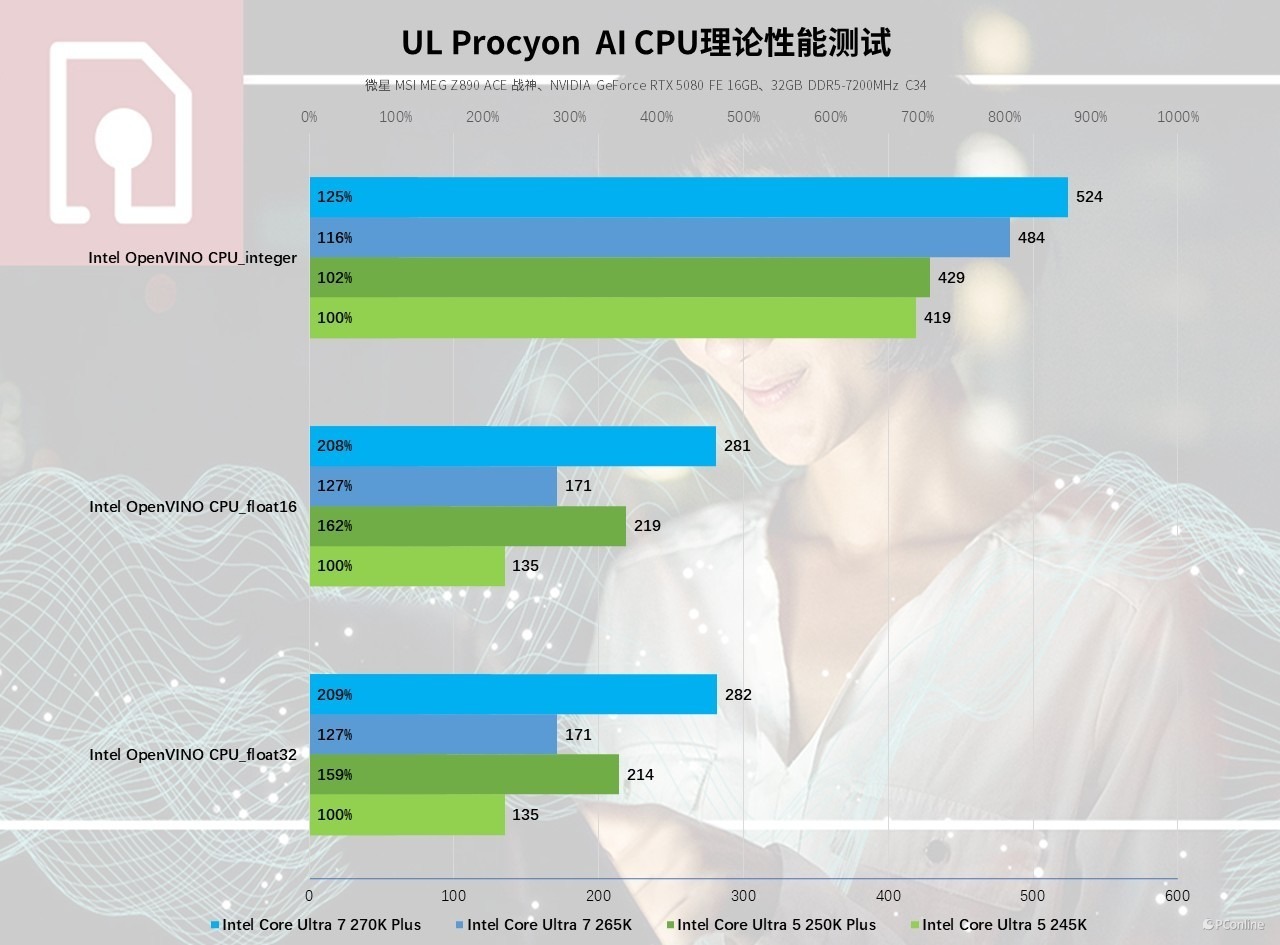 而CPU 端 AI 算力就更精彩了,凭借核心规格扩容、底层架构优化与首创二进制优化技术的加持,两款新品的 CPU 端 AI 算力实现了跨越式提升。以酷睿 Ultra 5 245K 为性能基准,酷睿 Ultra 5 250K Plus 在 integer 精度测试中实现 2% 的性能提升,float16 与 float32 精度测试中分别达成 62%、59% 的大幅跃升。酷睿 Ultra 7 270K Plus 表现也类似,integer 精度测试得分 524,对比前代提升9%;float16 与 float32 精度测试得分分别达到 281、282,提升幅度更是来到了73%,在重度 AI 推理、批量 AI 运算场景下展现出极强的处理能力。