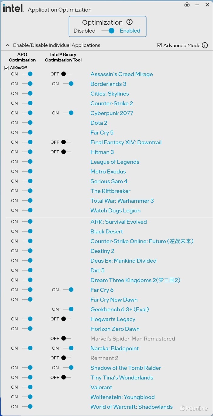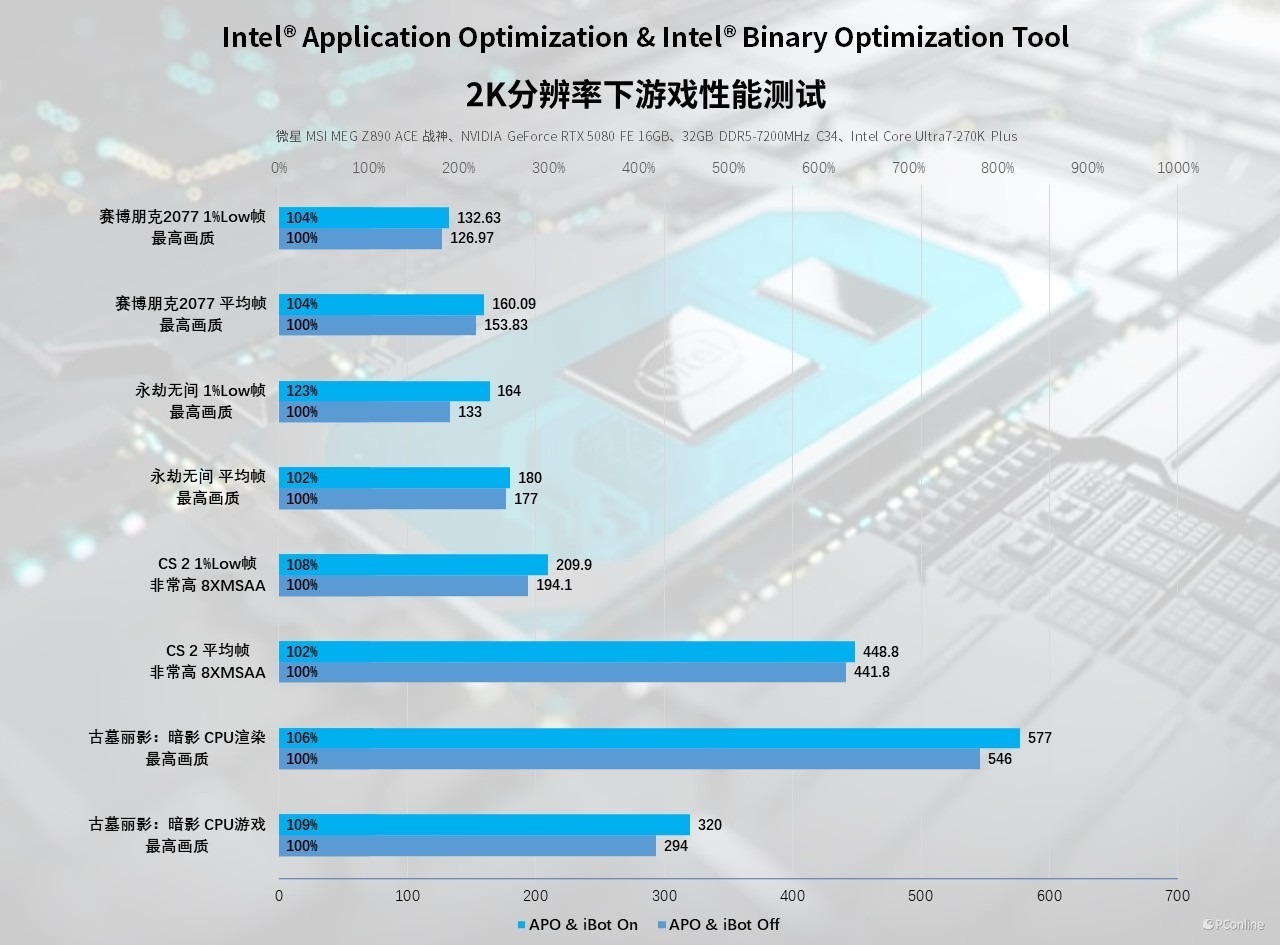 看完了基础的1080P测试,我们再看看本次更新的重点——Intel® Application Optimization & Intel® Binary Optimization Tool。其中 APO 技术通过优化应用程序的线程调度逻辑,最大化发挥处理器多核架构的性能潜力,针对热门游戏与常用软件进行专属适配优化;而英特尔首创的 iBOT 技术是本次性能跃升的核心。基于 40 年优化经验,它从底层提升了程序的 IPC 与运行效率。开发者无需任何额外适配,即可让针对其他架构或旧平台优化的程序直接享受原生性能的提升。