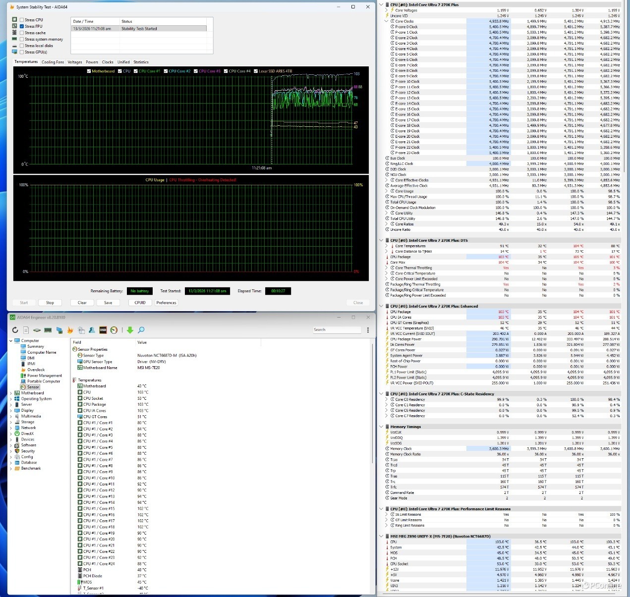 我们直接使用解锁全部限制的MSI Unlimited Settings模式测试,此时处理器封装功耗可以跑到320W以上,P核全核都在5.4GHz,E核则是全核平均4.7GHz。不过温度也有些高了,已经来到了103℃,我们用的还是360一体式水冷,因此选购旗舰级处理器的玩家最好上更强力的散热器去压制它,或者用微星的MSI Performance Settings或MSI Extreme Settings,性能与功耗能够做到更好的平衡。