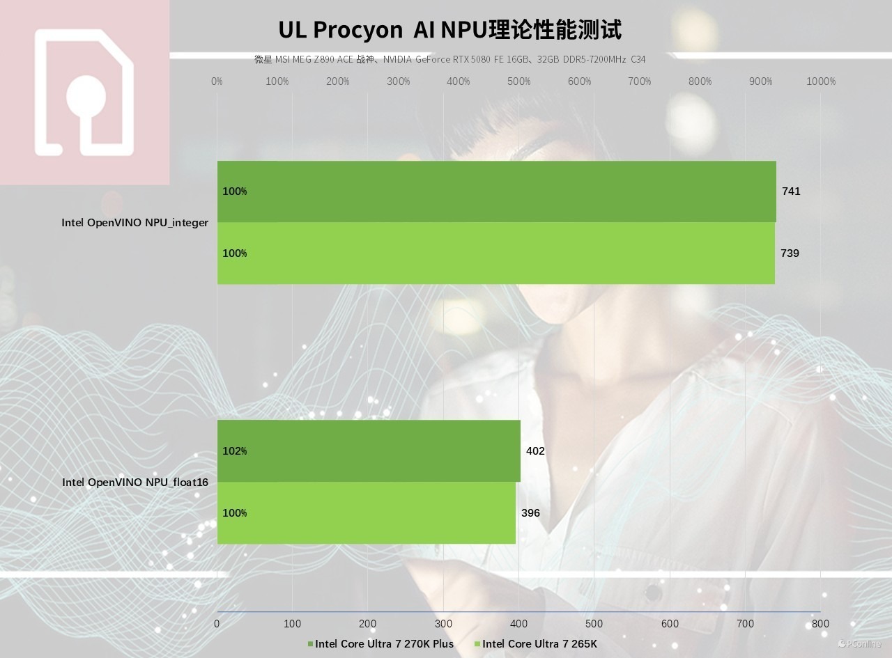 首先看NPU的表现,酷睿 Ultra 200S Plus 系列完整延续了酷睿 Ultra 200 系列的 NPU 硬件规格,性能表现稳定且一致,端侧 AI 算力输出能力拉满。实测数据显示,酷睿 Ultra 7 270K Plus 在 Intel OpenVINO NPU_integer 测试中得分 741,NPU_float16 测试中得分 402,与酷睿 Ultra 7 265K 处于同一水准,可稳定承接 AI 语音交互、实时字幕、轻量级 AI 推理等日常端侧 AI 任务,有效释放 CPU 与显卡的性能压力,为后续桌面端 AI 应用的全面落地提供了充足的硬件支撑。