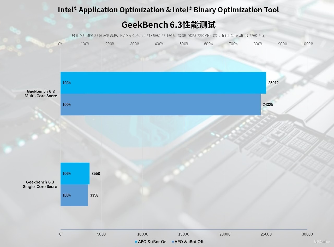 同时这项技术不仅能够作用于游戏,在部分软件中也能肉眼可见的看到性能提升。例如我们通过 GeekBench 6.3 基准测试,以酷睿 Ultra 7 270K Plus 为测试对象,验证了两项技术开启前后的性能差异。实测数据显示,开启 APO 与 iBOT 后,处理器单核得分从 3358 分提升至 3558 分,提升幅度达 6%;多核得分从 24325 分提升至 25012 分,提升幅度 3%。