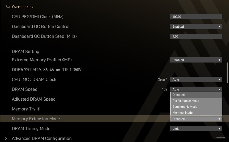 内存方面除了有熟悉的XMP、Memory Try it以及Memory Extension Mode外,还新增了一个全新的“Dragon Alliance Partner”功能,微星对内存超频进行了深入研究,通过专注于1 SPC设计、存储器IC开发、PCB增强布局以及专用BIOS功能优化实现更高的内存频率,它的作用是当你使用的内存与微星有合作时,那你将获得更高的性能释放。例如我们本次测试使用的,它能够冲击8600MHz的超高频率,稳定运行各项任务。