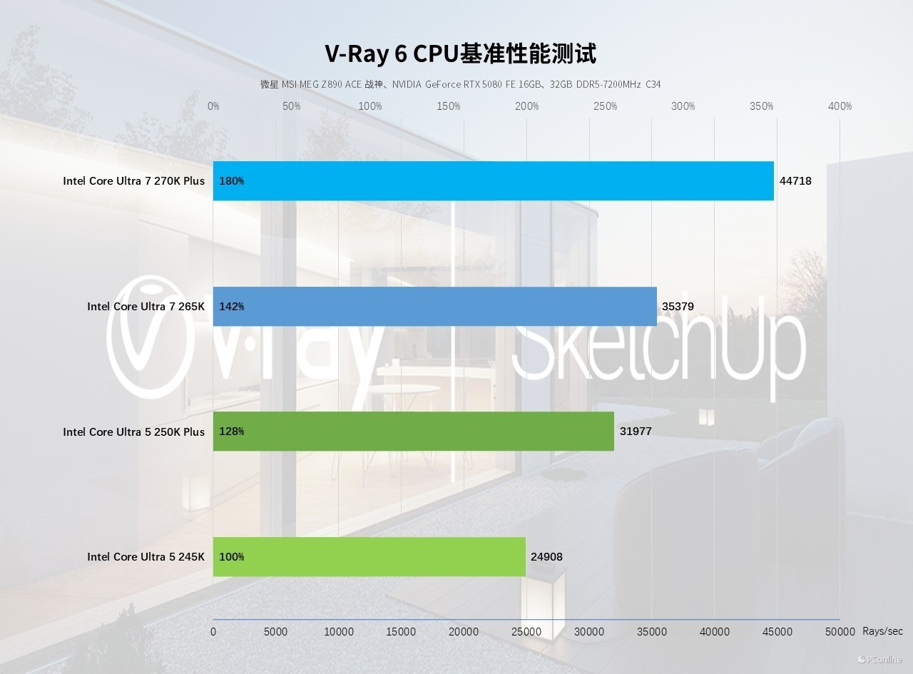 V-Ray 是影视动画、建筑可视化领域的行业标准级渲染引擎,其 CPU 基准测试可精准衡量处理器在专业光追渲染场景下的多线程算力,是专业创作者最关注的性能指标之一。实测数据显示,以酷睿 Ultra 5 245K 的 24908 Rays/sec 为性能基准,酷睿 Ultra 5 250K Plus 得分 31977 Rays/sec,相较基准提升 28%;酷睿 Ultra 7 270K Plus 得分达到 44718 Rays/sec,对比酷睿 Ultra 7 265K 也有着 27% 的显著领先,能高效承接建筑效果图、影视级渲染等重度专业负载。