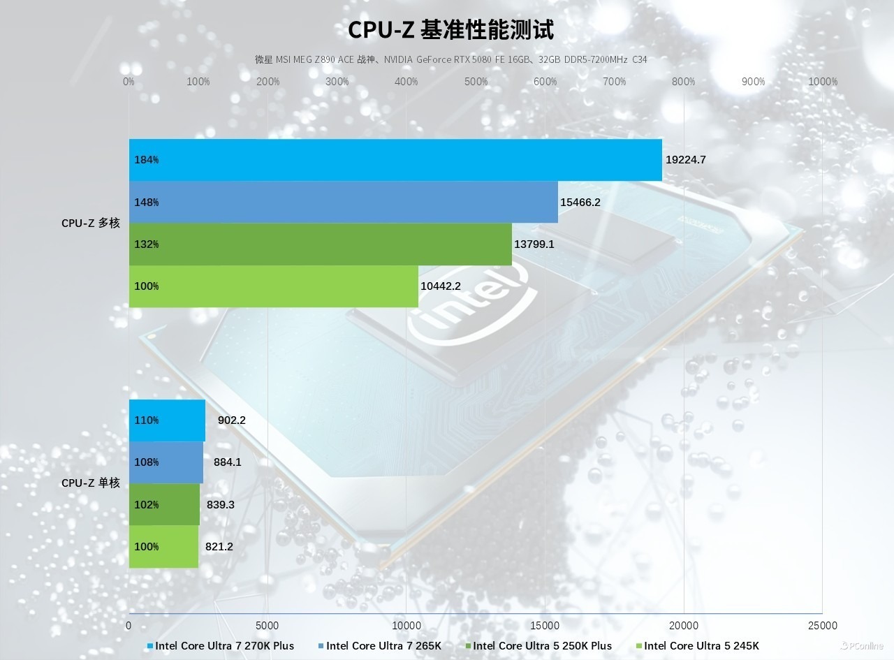 实测CPU-Z的性能测试,其中单核性能是衡量处理器单线程执行效率的核心指标,直接决定了竞技网游的帧率上限、日常软件的响应速度与单线程负载的处理效率。以酷睿 Ultra 5 245K 的 821.2 分为性能基准,酷睿 Ultra 5 250K Plus 单核得分 839.3 分,提升了约 2% 的性能;而酷睿 Ultra 7 265K得分 884.1 分;新款酷睿 Ultra 7 270K Plus 单核得分则达到 902.2 分,对比酷睿 Ultra 7 265K 也有 2% 的小幅领先。