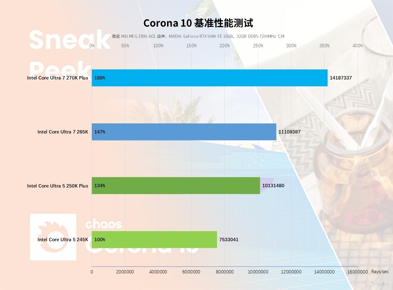 实测也可以看出新处理器的优势巨大,其中酷睿 Ultra 5 250K Plus 得分 10131480 Rays/sec,相较前代提升 34%;酷睿 Ultra 7 270K Plus 得分达到 14187337 Rays/sec,对比前代同系列的酷睿 Ultra 7 265K 也有着 41% 的显著领先。