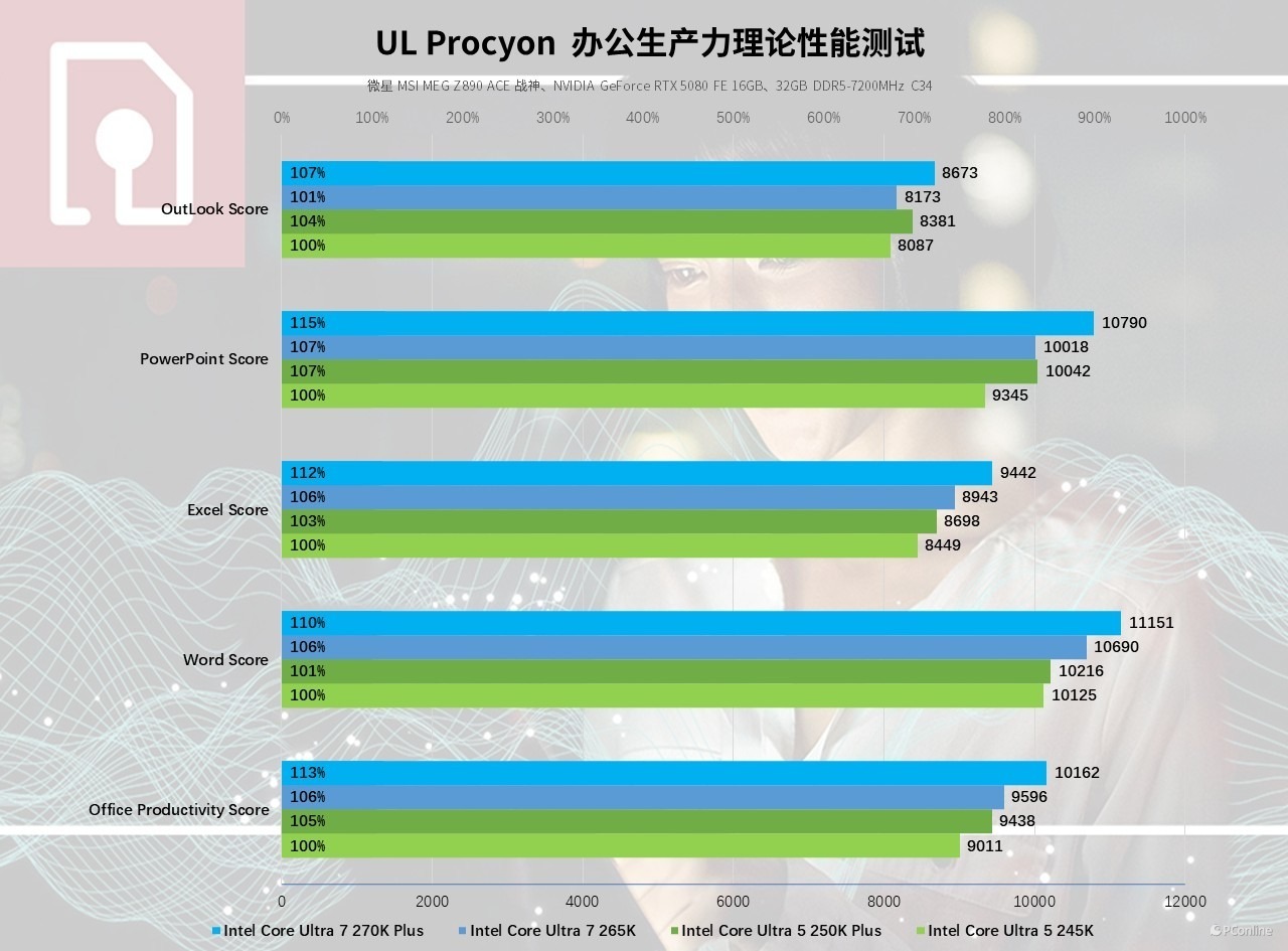 实测数据显示,酷睿 Ultra 5 250K Plus 办公综合得分 9438,相较前代提升 5%;酷睿 Ultra 7 270K Plus 办公综合得分 10162,相较前代也有7%的提升,其中 PPT 制作子项提升幅度达 8%,Excel、Word 子项也分别实现 6%、4% 的性能提升,即便是大数据表格计算、多页 PPT 动画渲染等重度办公负载,也能保持流畅的操作体验。