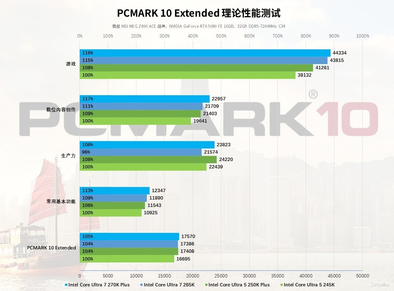 从实测数据来看,以酷睿 Ultra 5 245K 为性能基准,酷睿 Ultra 5 250K Plus 数位内容创作得分 21403,相较基准提升 9%;酷睿 Ultra 7 270K Plus 得分 22957,提升幅度达17%,前代对比的话,也有6%的性能优势,跟上面我们渲染测试的性能跃升基本吻合。生产力与日常基础功能方面,两款新品也均实现5%以上的稳定提升。至于游戏子项测试,这是提升最大的一环,酷睿 Ultra 7 270K Plus 得分 44334,而酷睿Ultra 5 250K Plus则是以41261的成绩领先前代8%,纸面表现亮眼,其真实游戏表现,我们将在后续实机测试中进一步验证。