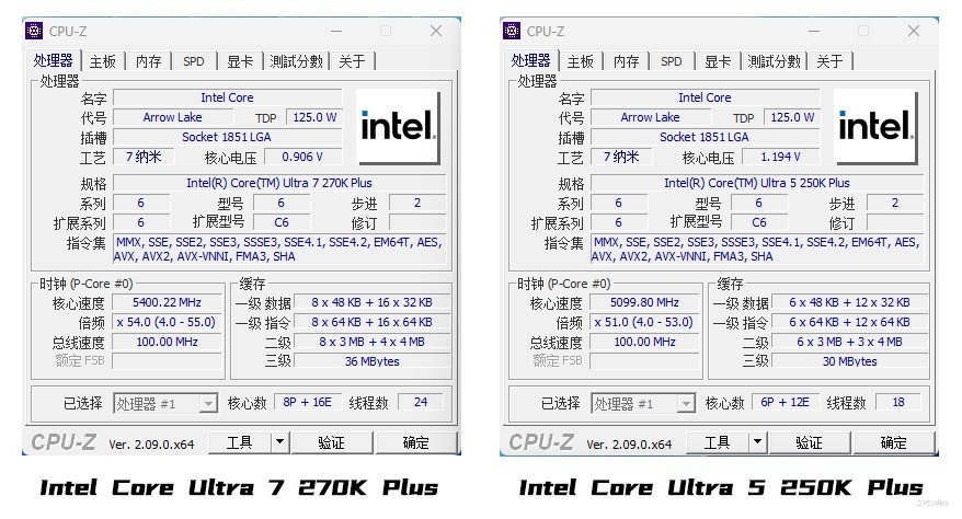 首先通过CPU-Z软件对平台硬件进行查看,可以看到平台CPU处理器部分使用的分别是24核24线程的酷睿Ultra 7 270K Plus处理器以及18核18线程的酷睿Ultra 5 250K Plus处理器。